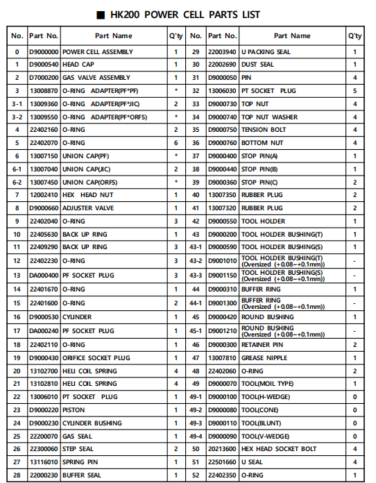 HK200 Spare Seal Kit Parts List: