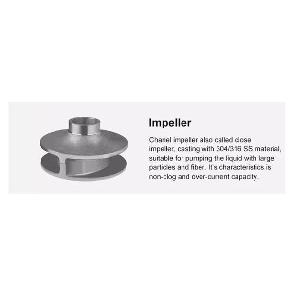 | Impeller | Chanel impeller also called close impeller, casting with 304/316 SS material, suitable for pumping the liquid with large particles and fiber. It's characteristics is non-clog and over-current capacity |