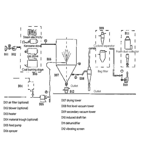 The original liquid would be feed by peristaltic pump, and become spray with help of High Speed atomizer, the atomizer would be driven by compressed Air. Peristaltic pump can be adjusted and stable, which can ensure feeding stably and control temperature effectively.