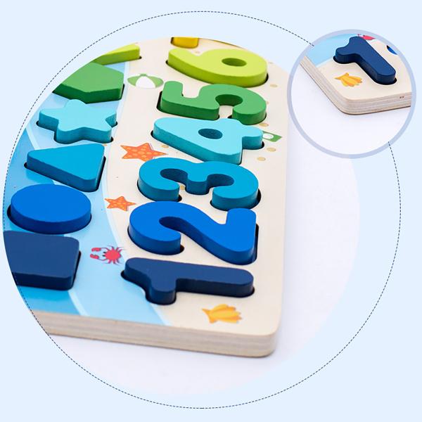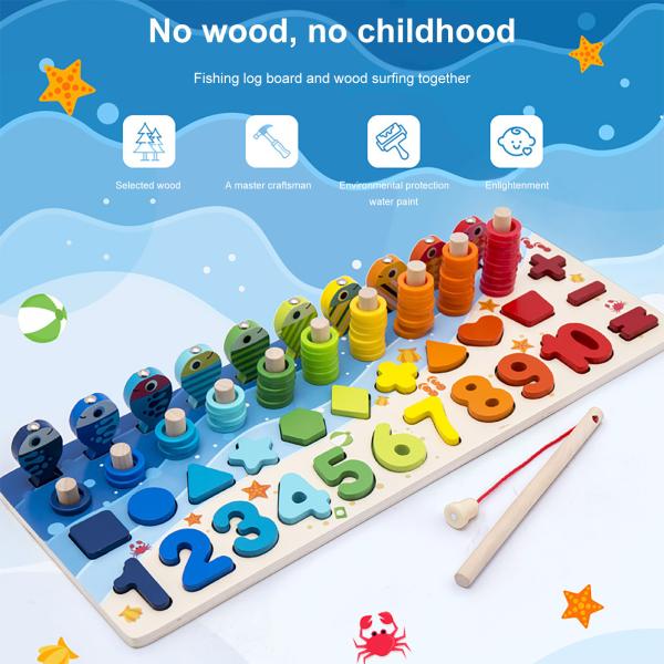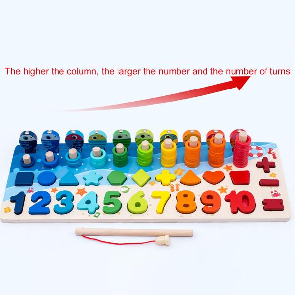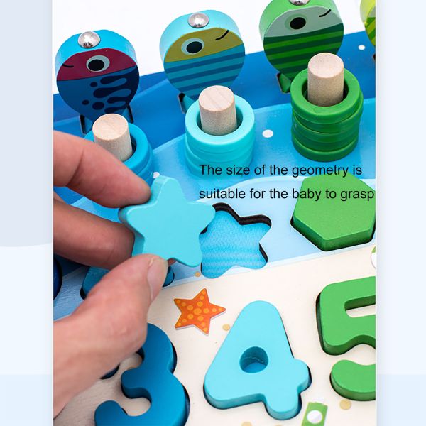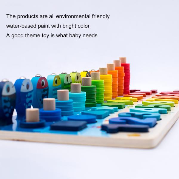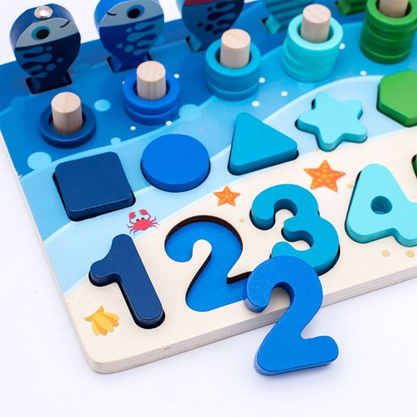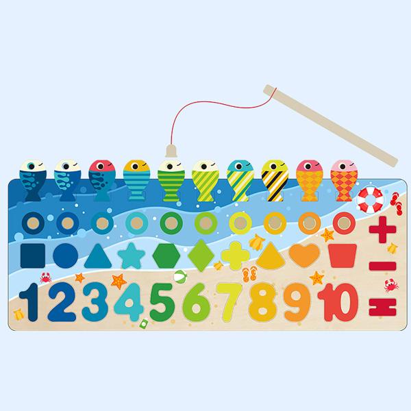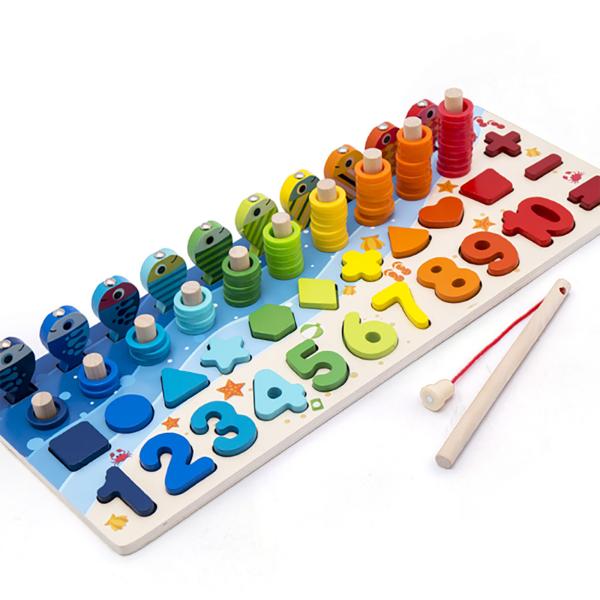 Match the colors of numbers, shapes, rings, and patterned fish with