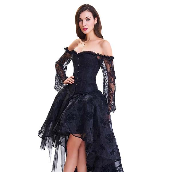 Steampunk elegant overbust corset featured with off shoulder design to show your beautiful shoulder and clavicle, fully overlayed with embroidery floral pattern, ruffled details, also match with charming long cuff floral lace sleeves. Busk closure at front, lace-up at back. It is suitable for steampunk-themed party, cosplay, Halloween party costume and night out show, or fashion show.