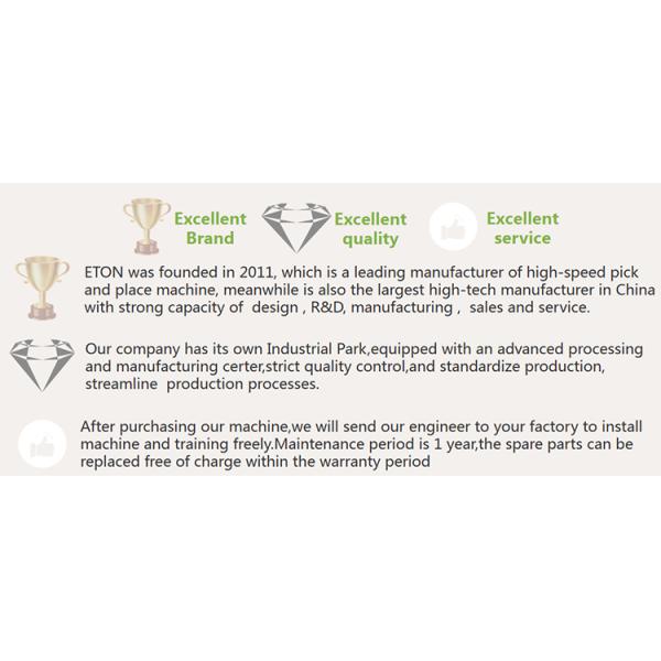 Our company is a leading manufacturer of automatic high-speed pick and place machine focusing on High efficiency Low consumption.ETON with more than 10 years experience in SMT machine field.And we have rated many awed,like Shenzhen high-tech enterprise,China high-tech enterprise,Industry Special Contribution Aware,etc.
