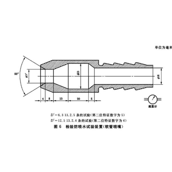 4. Test methods IPX5 water flushing test: flushing nozzle 6.3mm inner diameter; water flow 12.5L/min (750L/h); Distance between flushing nozzle to specimen is 2.5m ~ 3.0m. Test time is around 1m2/min (specimen surface area) and 3 mins at least.