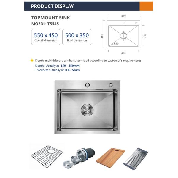 The overall dimensions of the T5545 Stainless are 550 x 450 x 220mm and a 600mm minimum cabinet size is required. This sink also features a stain, heat, and scratch resistant surface; it comes fully insulated and equipped with sound dampening pads. All sinks are covered by our limited lifetime warranty; your satisfaction is guaranteed.