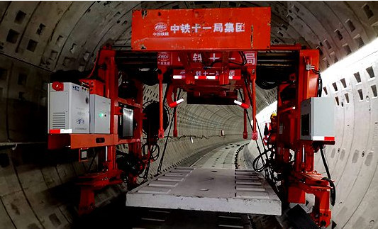 The metro track laying machine has a hydraulic system, which drives the hydraulic cylinder to adjust the height of the whole machine and change the running gauge of the whole machine. By using flat car and tooling support, the whole machine can realize automatic span and height adjustment in the tunnel; And rotate 90 ° After the use of flat car transit transportation.