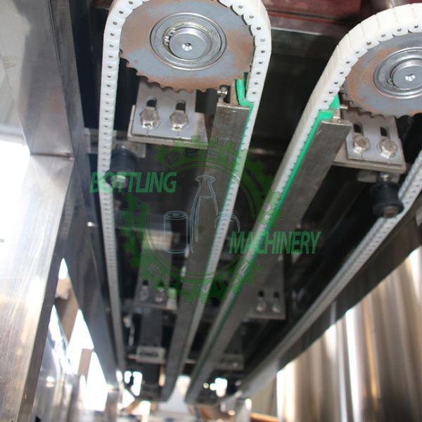 gallon bottles and the motor on above will transfer the bottles forwarding , and the workers put bags on