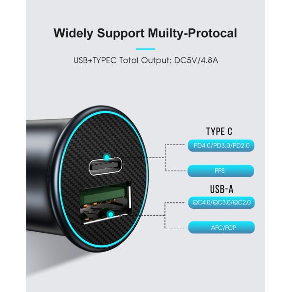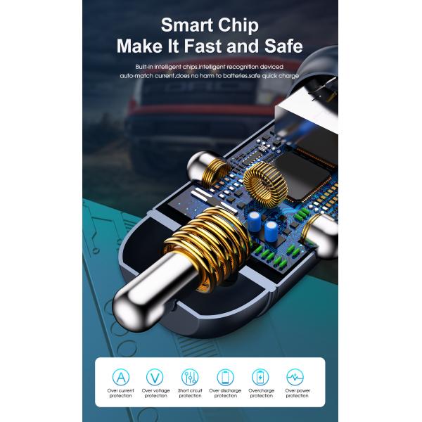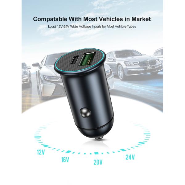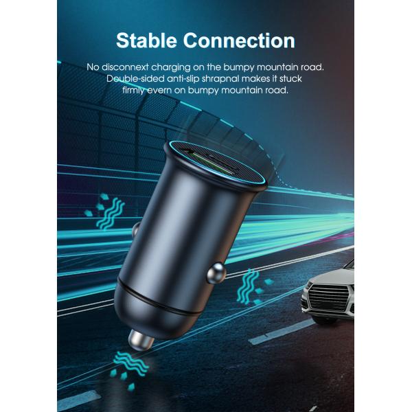 Tiny and invisible smallest PD car charger ever, the size just fit the car cigarette lighter,small and will not take up space. Mini 30w Quick Charge 3.0 Car Charger with stable connection, No disconnext charging on the bumpy mountain road,Double-sided anti-slip shrapnal makes it stuck firmly evern on bumpy mountain road. Mini 30w Car Charger Adapter is compatable with most vehicles in market(Load 12-24v wide voltage inputs for most vehicle types, 30W usb fast charger mini car charger with smart chip make it fast and safe(Built-in intelligent chips,intelligent recognition deviced auto-match current,does no harm to batteries,safe quick charger.