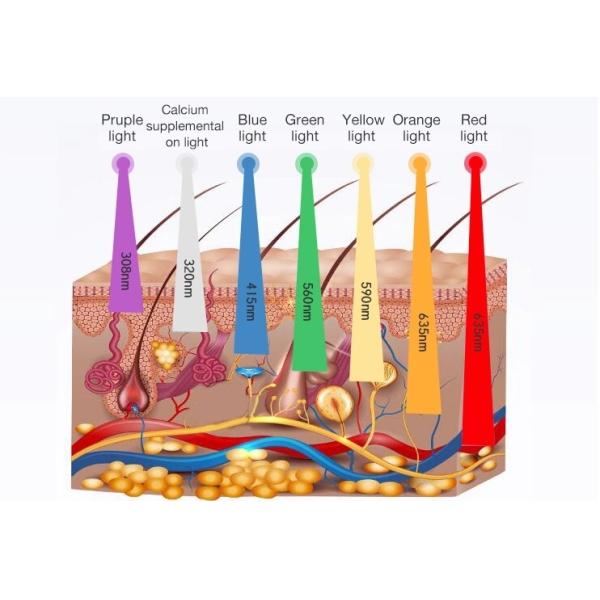 | 6 Light Colors & Wavelength | Red 635nm, Blue 464nm, Green 525nm, Purple 308nm, Orange 610nm, Yellow 590nm |
