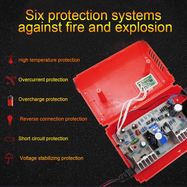 Battery reverse connection:When the output of charger is reverselybattery electrode, the charger never starts, and no output. When the connection is right, the charger can start to work automatically.