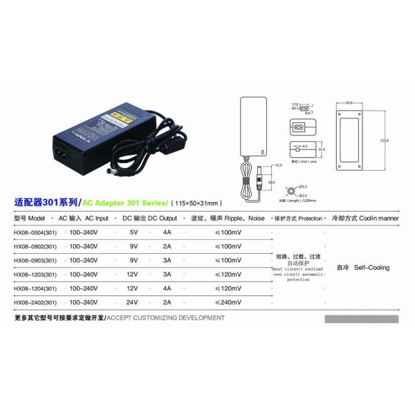 | HX08-1203(301) | 115*47*32 | 100-240VAC, 50/60Hz | 12V | 3A | >78% |
