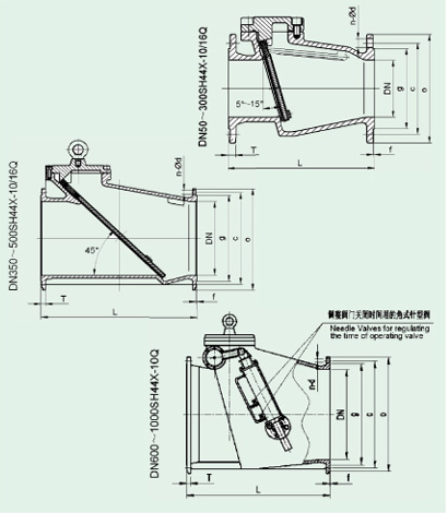 O The valve is opened and closed by the damping oil. The oil device adopts two level and controlled of damp. When the disk is far from the sealing surface, the oil flow through double pipes, closing fast; When near the sealing surface,the oil flow through single pipe, closing slow. It can avoid the impact of the disk to the sealing surface , increase the durability of valve.