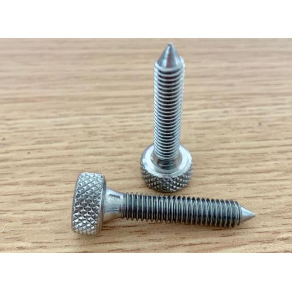 Knurled thumb screws have a diamond, or knurled, slip-resistant screw head that is designed for controlled adjustment. Shoulder pattern thumb screws can have a straight shoulder or flared shoulder, which can also be called a washer face. All screws are fully threaded unless otherwise noted, and length is measured from under the head. Knurled thumb screws are commonly supplied in steel, stainless steel, brass, aluminum, and a variety of other exotic metals and plastics.