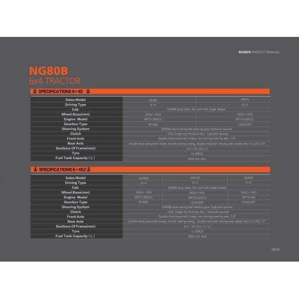 Cab | NG80B Long cab with one sleeper Full steel skeleton structure, covered with double layer steel plate; Can be tipped forwardly; | |||