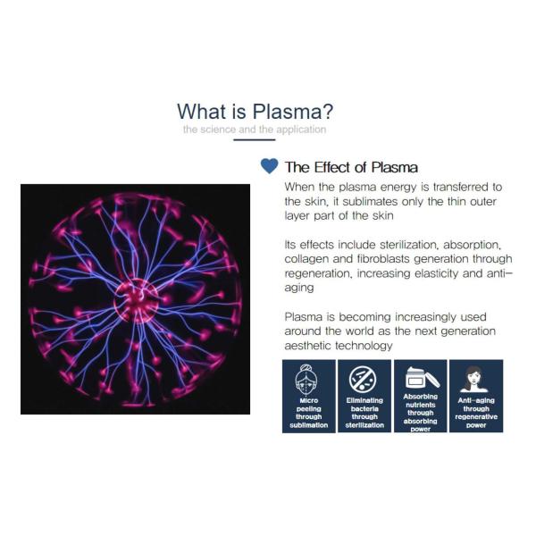 Plasma shower handpiece removes the bacteria and helps absorb essential drug to the skin tissue. A strong low-temperature atmosphetic plasma on the surface of the skin sterilize the skin and the ionized radicals stimulates the skin treatment process such as skin regeneration, anti-bacteria, TDDS(Transdermal Drug Delivery System), skin whitening and collagen generation.