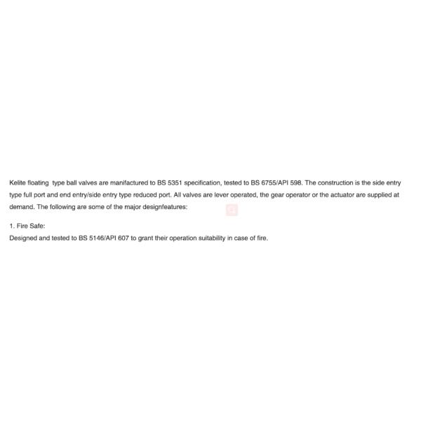Split body, full bore/reduced bore, floating ball, fire-safe certified to API-607/6FA, anti-blow out stem, cavity relieving seats, anti-static device, RTFE, Delrin, NYLON&DEVLON seat inserts. Floating ball valves are designed, constructed and tested according to the most recent international standards, such as API, ASME, BS, DIN, etc.