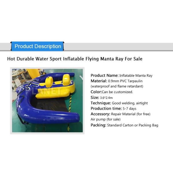 The Inflatable Flying Manta Ray will offer you a different fun experience for your summer holiday. Just sitting on the body of the inflatable Manta Ray, and hold the handles, realxed yourself and waiting for the crazy surfing of the water throughing a towable water scooter. Along with the high speed Water Scooter, when you flying up and down the wave, you can't help yourself to cry out loudly.