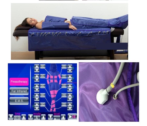 The pressotherapy, with a set of cloth-like accessory and 8 pieces of air bags, which allows for pressure by cycles or all-together for both the whole body and certain parts of the body, is a compression system designed to increase the venous and lymphatic flow and enhance extra-cellular fluid clearance.
