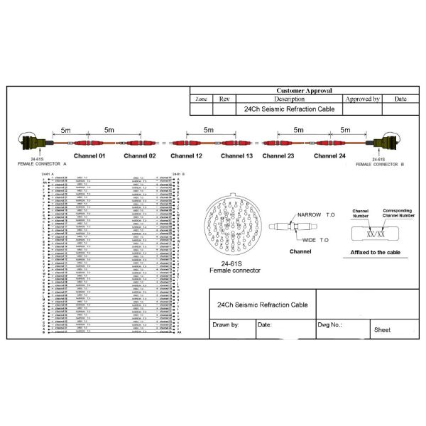 24 Channels seismic refraction cable, with 24 pcs Mueller Clip Take-out, Interval 5 meters , lead in cable 10 meters at both end and terminated with 61 pin (24-61S) female connecter. Total seismic cable length 135 Meters .