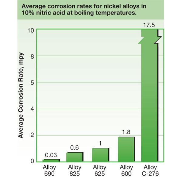 The alloy resists attack by mineral acids such as hydrochloric, nitric, phosphoric and sulfuric, and to alkalis and organic acids in both oxidizing and reducing conditions.