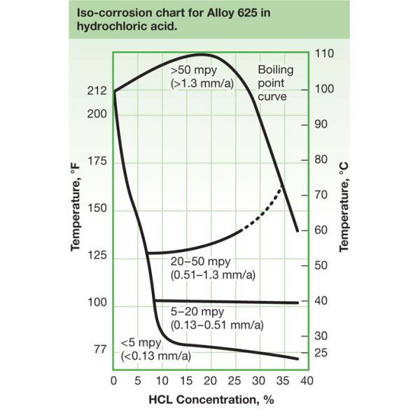 The chemical composition of Alloy 625 is also responsible for its outstanding corrosion resistance in a variety of severe operating environments along with resistance to oxidation and carburization in high temperature service. The alloy is resistant to pitting, crevice corrosion, impingement corrosion, intergranular attack and is almost immune to chloride stress corrosion cracking.