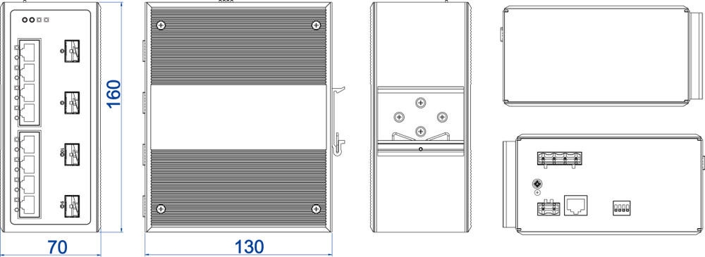 | Interface | Copper port: 10/100/1000Base-T(X), RJ45, Automatic Flow Control, Full/half Duplex Mode, MDI/MDI-X Autotunning SFP slot: 1000Base-SFP Console port: CLI command line management port (RS-232), RJ45 Alarm port: 2-pin 7.62mm pitch terminal blocks, support 1 relay alarm output, the current load capability is 1A/24VDC; 0.5A/120VAC |