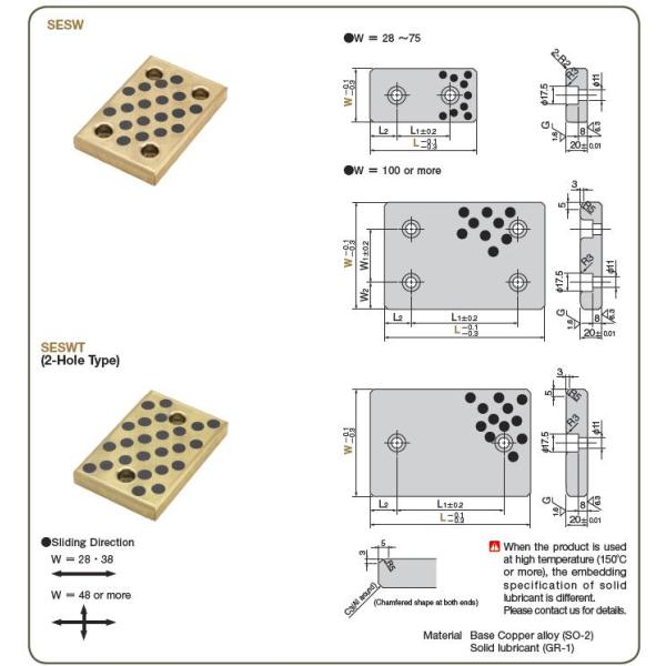 | Copper alloy | Graphite | 20 | SESW | Excellent in load resistance and wearExcellent sliding performance at high load and low speed.resistance. Good performance is shown in reciprocating and frequent starts and stops. |