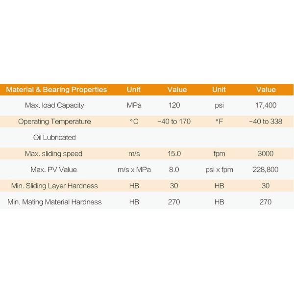 • Durability and strength - Sintered bearing liners bring different levels of durability and fatigue strength. For instance, auto engine and transmission applications have primarily low loads yet high rotating speeds. A TriSteelsteel-backed bearing with a CuPb30 liner will give a load capacity of 3600 psi, speed to 2900 fpm Hardness: HB30-45, Temperature: -40 to +325F. 0.08-0.16, plus low friction and good dry breakaway properties.