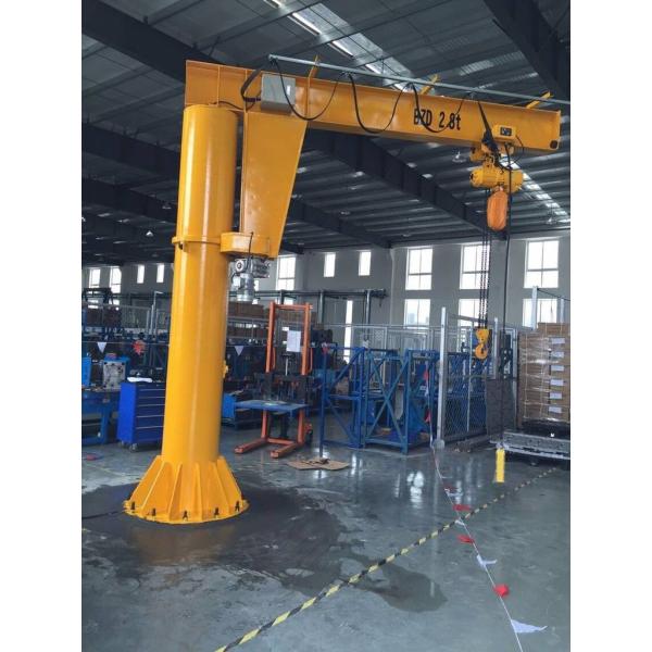 Free Standing Arm Jib Cranes are directly fixed on the ground without any support to keep it upright. To maintain it’s stability and not topple over, it is fixed to a 3 to 5 feet deep and 4 to 10 feet square foundation base. The foundation depends on the load and reach. The big advantage of this type is that it doesn’t need a support wall or structure and provides optimal range of span and control compared with wall mounted cranes and other types of Jib cranes. The following picture here shows a 2.8 ton free standing jib crane used in a warehouse.