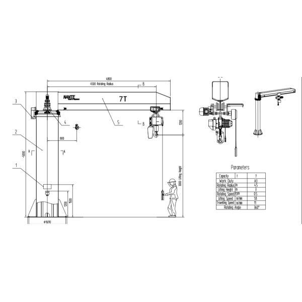 | Lifting Capacity | Trolley Travel Mode | Rotation Mode | Rotation Radius | Liftinf Height | Overall Height | Rotation Angle | Lifting Speed | Trolley Speed | Control Mode | |