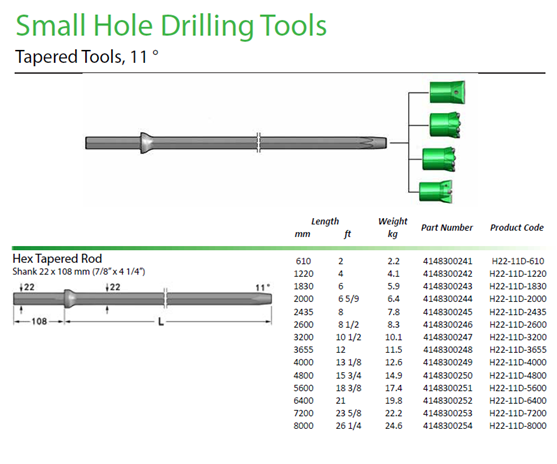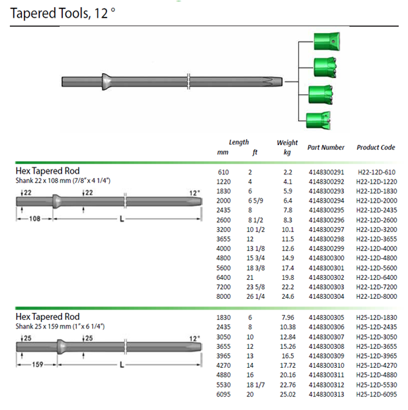 Tapered drill rods | Taper Angle: 4, 6, 7, 11, 12 degree | 400mm to 8000mm | Hex22mm*108mm Hex25mm*159mm Hex19mm*108mm | 1.7 - 24.9 |