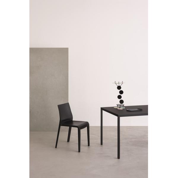 Not stackable chair, with hand-sewed covering in cow hide, cuoietto, leather and ecoleather, and structure of polypropylene reinforced with fibre glass. Available in all the colours of our collection.
