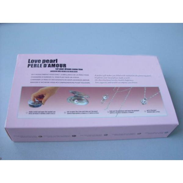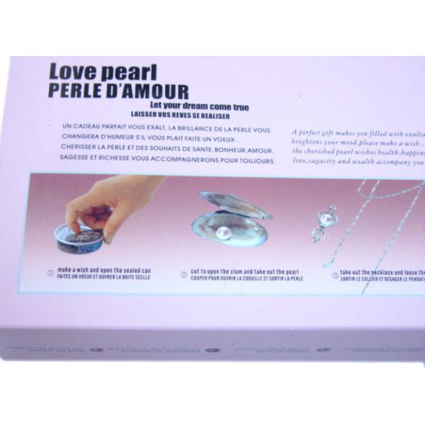 Love pearls with English version -- "Make a wish, realize the wish" this is the perfect Christmas gift for a girl of any age. The beautiful red box contains a real oyster with a genuine cultured pearl inside. After the oyster is opened and the pearl is removed there is a silver colored chain and cage pendant to put the pearl in and wear. The pearl could be white (for health), cream (for happiness), peach (for love), lavender (for wisdom), or gold (for wealth), you won't know until you make a wish and open the oyster.Only nature could create such a perfect gift----Love pearls.