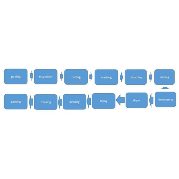 This Full automatic frozen french fries production line machine and fully automatic potato chips production line is mainly composed of potato washing & peeling machine, cutting machine, blanching machine, dehydrator, frying machine, deoiling machine, flavour machine and packing machine. Easy operation, high output and good production effect. Potato chips and French fries seem very smooth and uniform. Besides,the thickness could be adjusted freely. Apart from making potato chips, French fries, you could also make Frozen French fries(equip with IQF quickly freezer).
