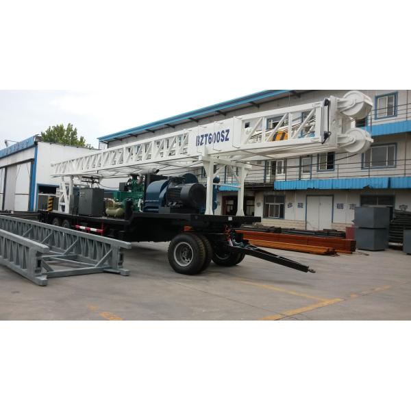 1. BZT600 water well drilling machine is installed on a trailer together with diesel generator, large displacement piston pump, double-hoist, turntable, drilling tower, auxiliary unloading cylinder and other components. It can be traction through tractor or truck. It is installed 4 hydraulic legs and 2 mechanical legs, every hydraulic leg rod with locknut. After leveling the rig, it can lock the cylinder use locknut. So, even if the cylinder leaks, the chassis is not instability.