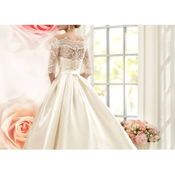 This cream satin sweep train wedding dress is beautiful with ball gown shape. Sexy but elegant style is very suitable as a wedding dress. Top pretty lace with