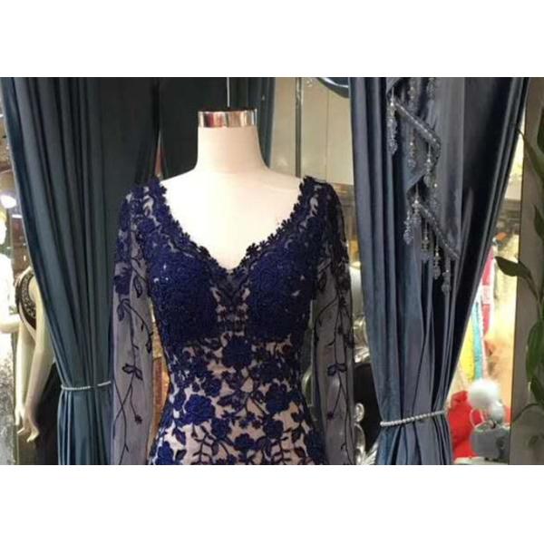 Navy Blue Long Sleeve Lace Mermaid Prom Dress V Neck Backless Sweep Train See Through Style