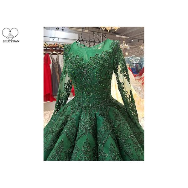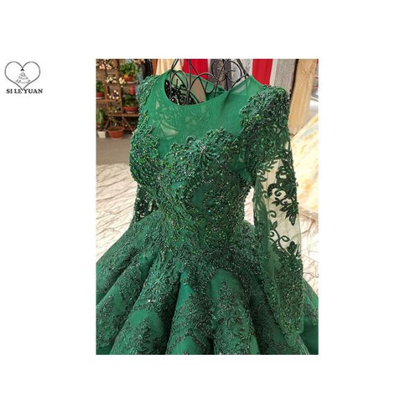 Green Luxury Heavy beading Satin Prom Dresses With See Through Long Sleeves And Floor Length