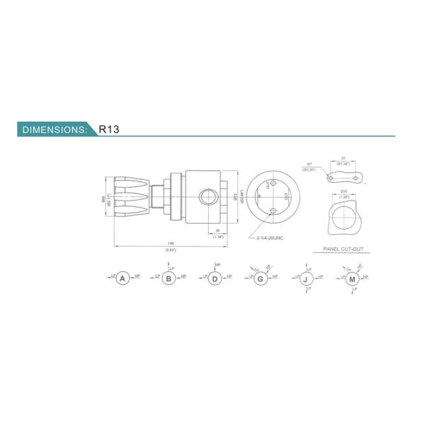 | R13 | L:316 | A | E:1500psi | H:0~125psig | G:MPa gauge | 04:1/2”NPT(F) | 04:1/2”NPT(F) | P:Panel mounting |