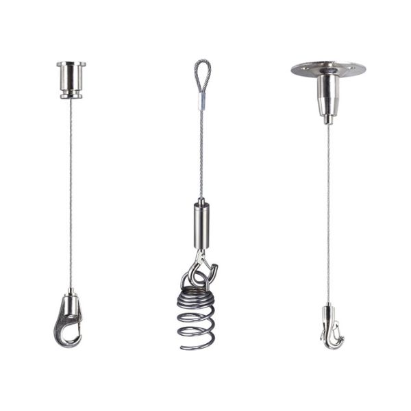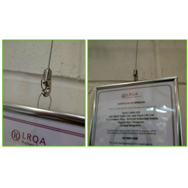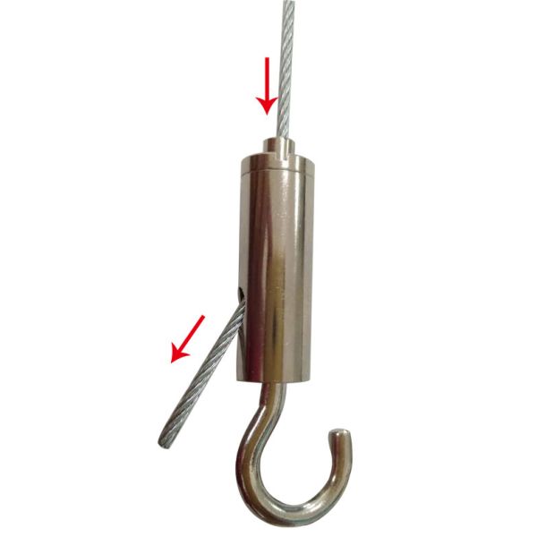 Slide the hook up a support wire (usually 1.5mm dia) and it locks fast wherever it is placed. To lower simply depress the quick release button as shown on the image. The clutch mechanism is released until the suspended item is at exactly the right height. Excess wire can then be snipped off.