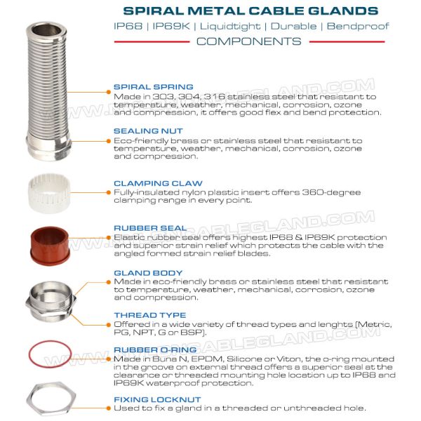 With advantages of high impact resistance, wide clamping range, high and low temperature resistance and weather resistance, Hermetic IP68 Stainless Steel Metric Cable Glands Type 304/316/316L M12~M50 with Anti-kink and Bend Protection come with an additional spiral protective spring and have the ability of chemical resistance, corrosion resistance and heat resistance, and it also has the ability of high tensile strength, high tenacity, good water resistance, excellent bending protection and long service time.