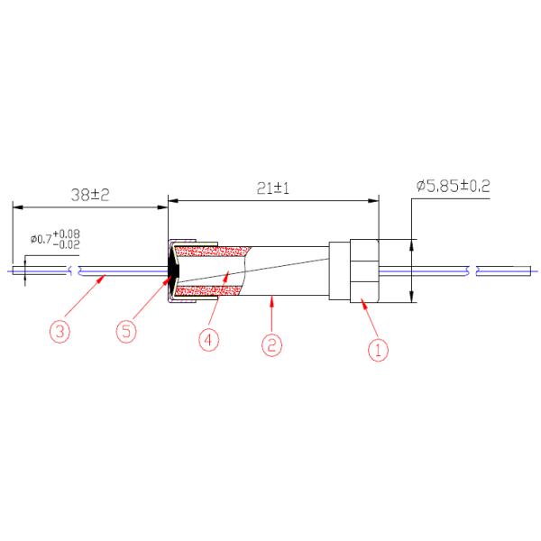 ①Brass Cap ②Ceramic Tube ③Lead Wire ④ Fuse Element ⑤Soldering Tin |