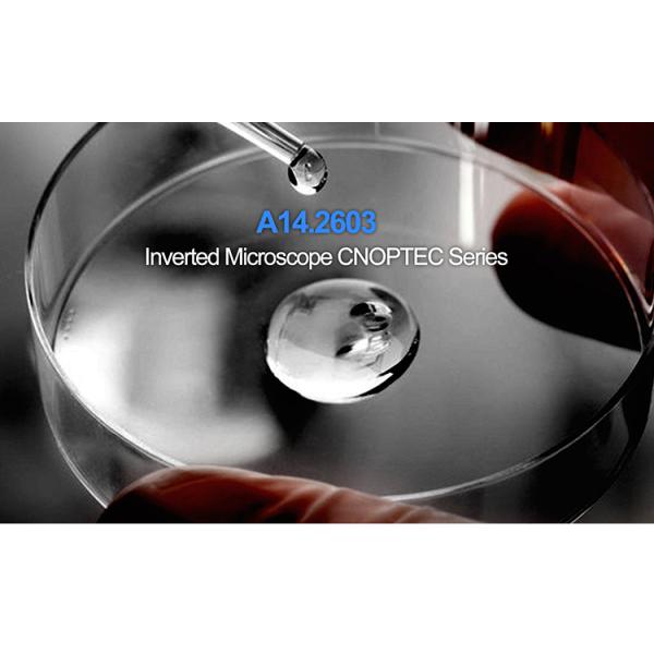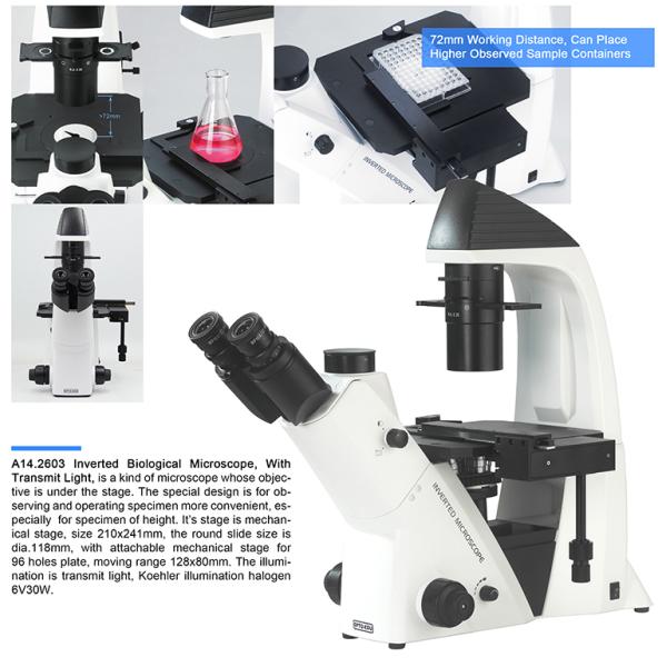 A14.2603 Inverted Biological Microscope is a kind of microscope whose objective is under the stage. The special design is for observing and operating specimen more convenient, especially for specimen of height. It’s stage is mechanical stage, size 210x241mm, the round slide size is dia.118mm, with attachable mechanical stage for 96 holes plate, moving range 128x80mm. The illumination is transmit light, Koehler illumination halogen 6V30W.