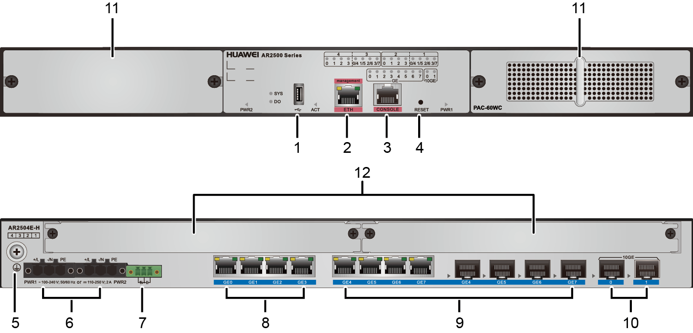 | 11 | Two power module slots Applicable power module: 60 W AC power module | 12 | Two WSIC slots |