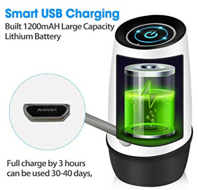 USB Rechargeable Battery: Built-in rechargeable 1800 mAh and 3600 mAH battery. 1800 mAH battery can be used for 20-30 days or around 4-7 bottles of 5-gallon water, 3600 mAH battery can use for 30-50 daysor around 7-10 bottles of 5-gallon water once full charged. No need to charge every day.