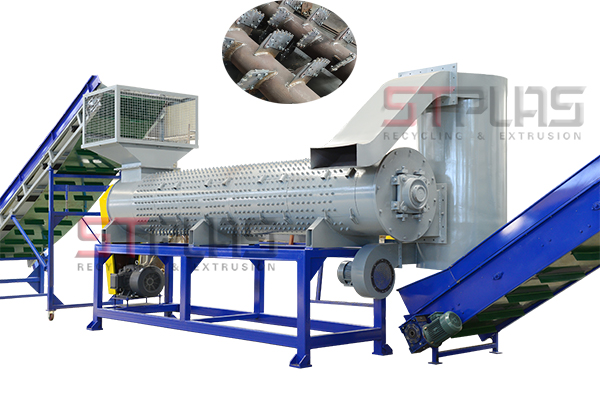 Conveying PET bottle→lable remover→ manual sorting table → wet crusher→screw loader →Hot washer→screw loader→high speed friction washer→screw loader→floating washer→screw loader→spray washer → dewater machine → pipe line dryer → label seperator → blower → hopper