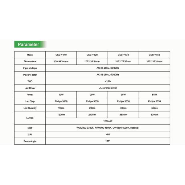 CES.YXY-XTGD-50W | 50W | 120lm/w 6000lm | 3030 50pcs | 275*225*48 | AC85-265V | >80 | IP66 |