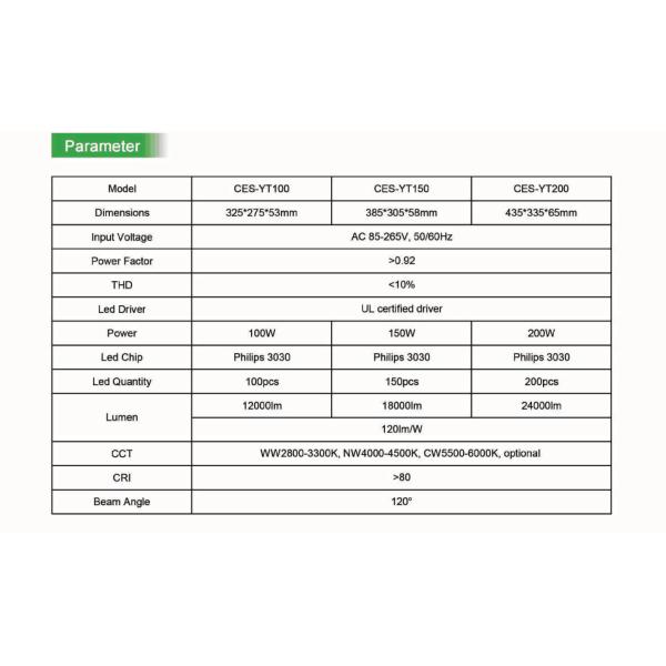 CES.YXY-XTGD-150W | 150W | 120lm/w 18000lm | 3030 150pcs | 385*305*58 | AC85-265V | >80 | IP66 |