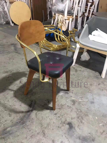 The feet of this dining chair is made by solid wood, the backrest is curved plywood. But the chair's armrest and connections are made by electroplating metal. To make sure the comfortable seating feel, its cushion filled by high density foam and covered by squared leather.