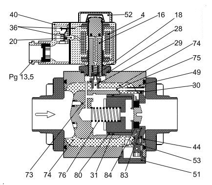 EVRA 25, 32 and 40 are servo operated piston valves. The valves are closed with currentless coil. The servo piston (80) with main valve plate (84) closes against the valve seat (83) by means of the differential pressure between inlet and outlet side of the valve, the force of the compression spring (76) and possibly the piston weight. When current to the coil is switched on, the pilot orifice (29) opens. This relieves the pressure on the piston spring side of the valve. The differential pressure will then open the valve. The minimum differential pressure needed for full opening of the valves is 0.2 bar.