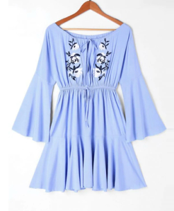 Blue Off Shoulder Mexican Embroidery Beach Casual Dress Women